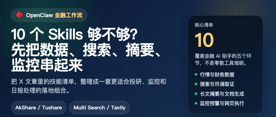 如果让我给金融团队搭一套 OpenClaw 工作流,我不会从“装多少工具”开始,而会先看链路能不能闭环。对我来说,这 10 个 Skills 真正有价值的地方,不是名字多,而是它们刚好能把数据获取、信息搜索、内容处理、实时监控和网页执行串成一条完整链路。