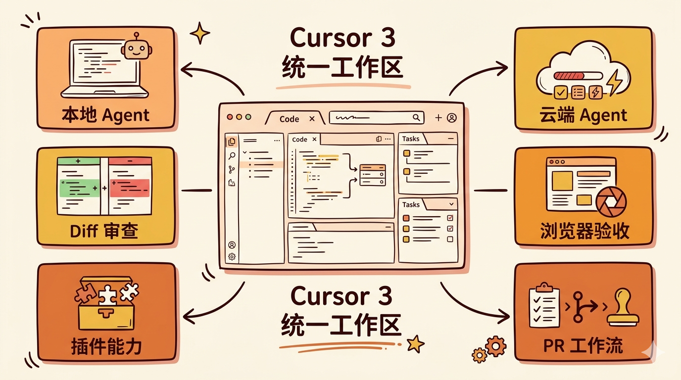 Cursor 3 的核心不是单点功能,而是三件事终于被接到一起了。