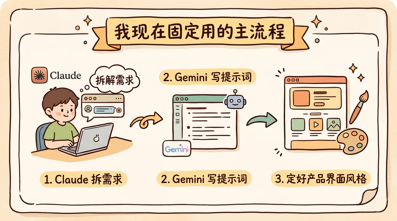 所以我的建议很明确:先用 Claude(Cloud)分析需求,再用 Gemini 生成提示词,最后进 Google Stitch 做风格与页面。