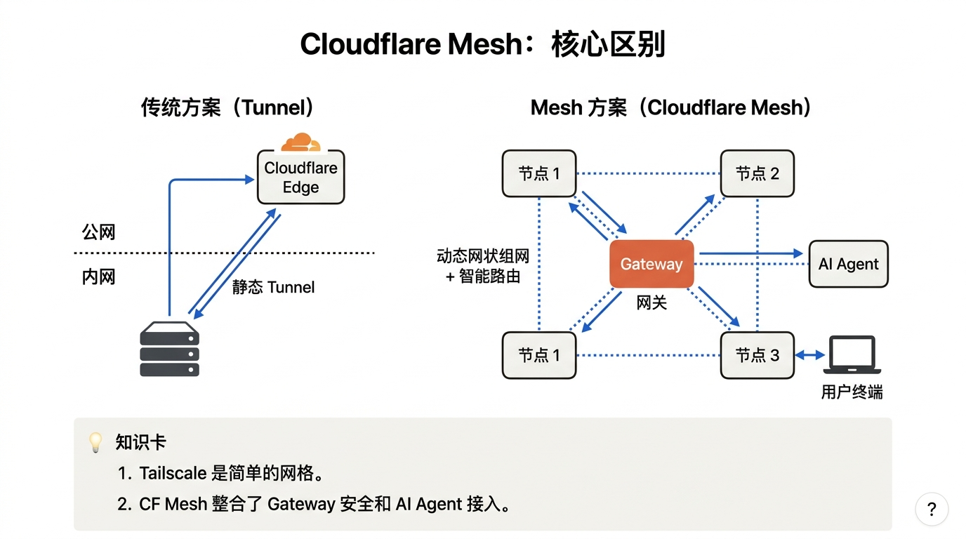 - Cloudflare Mesh:所有流量走 Cloudflare 网络,重点是统一安全策略、Zero Trust 集成、设备 posture、Gateway 规则,以及后续和 Workers、Agent 工作流打通